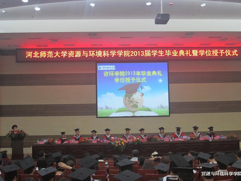 河北师范大学资源与环境科学学院2013年毕业典礼暨学位授予仪式于6月14日上午10时在我校博物馆会议室隆重举行。河北师范大学党委副书记吕文一、资环学院院长葛京凤、资环学院书记任国荣、导师代表王卫、黄华芳、南月省、张义文、梁秋生、李月丛、冯忠江、孙桂平、全体辅导员以及294名毕业生参加了此次典礼。此次典礼由学院党委书记任国荣主持。