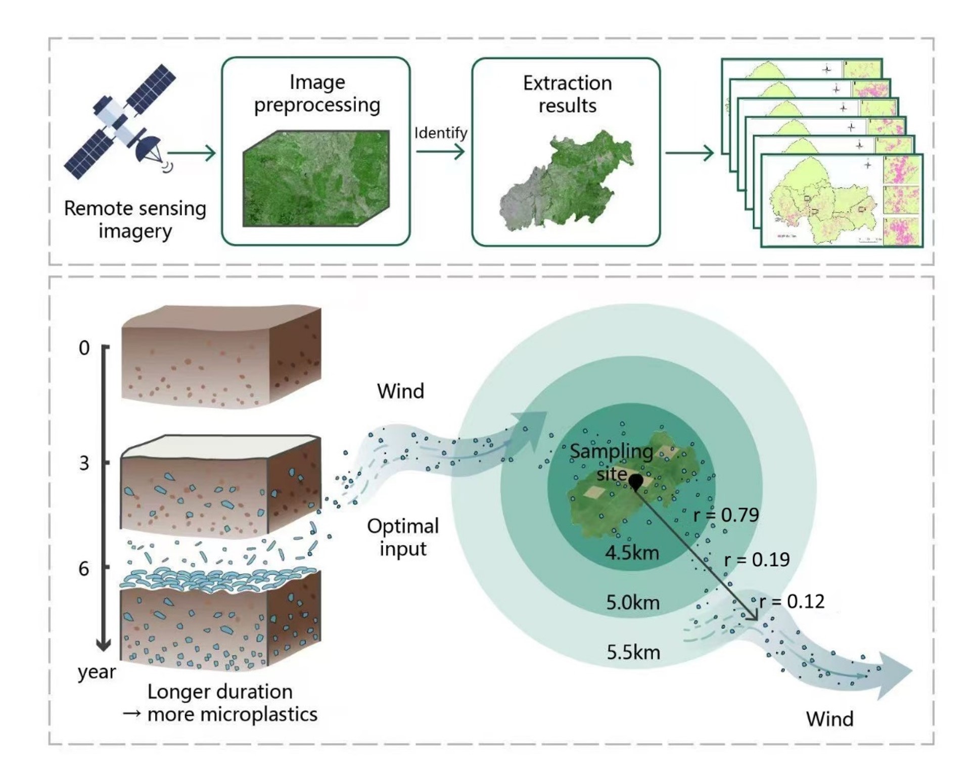 我国西北干旱半干旱农田大量使用地膜提高农作物产量,不断累积的地膜残片叠加其他塑料废弃物导致严重的农田表层土壤微塑料污染。风蚀作用下土壤微塑料释放是大气微塑料的重要来源,随风起扬的微塑料在景观或者区域尺度上导致下风向地区大气和水土资源污染。研究组评述了我国当前农田塑料污染的形势以及防治举措,利用多源遥感和人工智能技术结合地面调查确定了京津风沙源区典型区域的地膜分布状况,分析了覆膜农田表层土壤微塑料丰度影响因素的空间尺度效应,发现了土壤微塑料点源污染的“4.5千米半径现象”。研究组通过风洞试验率先证实风沙流中微塑料颗粒带电,测定了不同微塑料特征(材质和粒径)、土壤理化性质和风速等条件下风沙流中微塑料带电性质、电量及其分布概率等关键参数,分析了风速、土壤性质和微塑料特征与微塑料带电参数之间的定量关系,并基于量纲分析法构建了微塑料带电参数模型。与此同时,通过改进的密立根油滴实验方法,系统研究了电场力作用下球形、薄膜、纤维等主流形态微塑料的临界起跳电场强度,构建了临界起跳电场强度模型,推导出电场力影响下主流形态微塑料的临界起动风速模型。在上述研究的基础上,基于WRF(Weather Research and Forecasting Model)框架分析了电场力对微塑料沉降速度乃至区域运移的影响。系列研究有助于深入理解我国北方干旱半干旱区土壤微塑料污染形势以及微塑料运动机制,并提高大气微塑料区域输运路径和规模的预测精度。