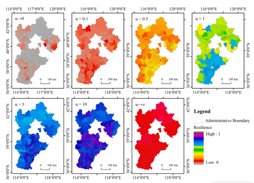 河北省是全国重要的粮食主产区,其耕地利用系统安全和粮食供需流动格局对京津冀乃至全国粮食安全具有重要意义。耕地利用系统(CLUS)是社会生态系统中最敏感的系统之一,受到人类活动和自然环境干扰的影响。研究其韧性对于确保粮食安全和生态安全至关重要,同时也促进社会公平与正义。基于国际上“行星边界”研究理论,研究团队安全与公正空间框架下分析了河北省耕地利用系统的韧性时空变化,识别其不同的演化阶段,模拟了三种决策风险情景下韧性能力的变化。指出河北省的耕地系统韧性经历的、“社会生态陷阱中”“应对陷阱”和“逃离陷阱三个阶段”。通过现状型、发展优先型和耕地保护型多情景模拟识别未来耕地优化调控区,为区域耕地利用政策提供了基础支持。在评估耕地系统安全基础上,团队进一步基于生态系统服务流分析多时空尺度下粮食供应服务流的供给、需求和流量,识别粮食流动路径。同时引入E2SFCA(the EnhancedTwo-step Floating Catchment Area method)方法量化近40年粮食供给服务流,解析不同流动情景下粮食流动前后供需匹配格局的变化,研究推动了对粮食供给服务的动态供需关系的深入认识,也明确了粮食供需匹配优化的粮食流动距离阈值。